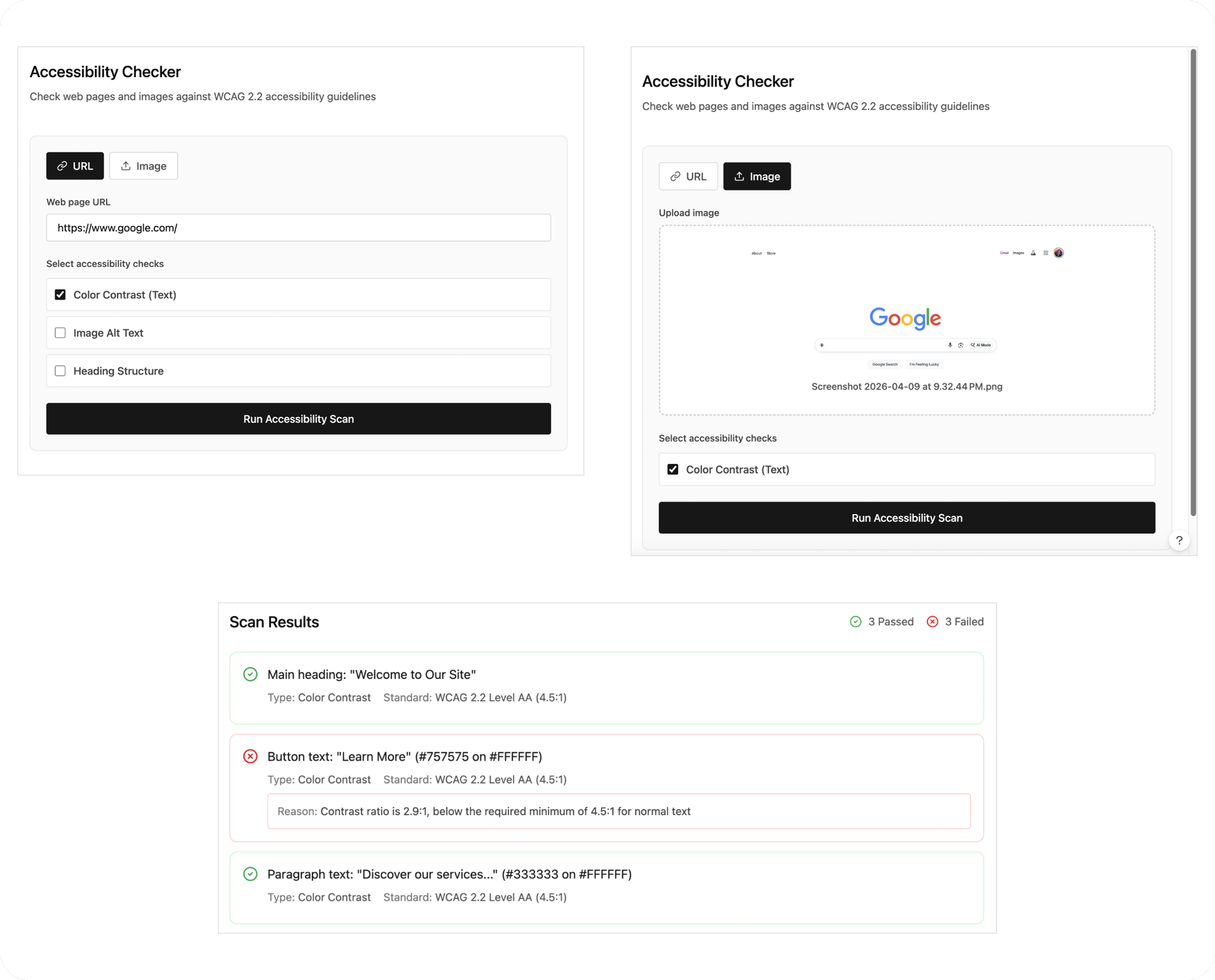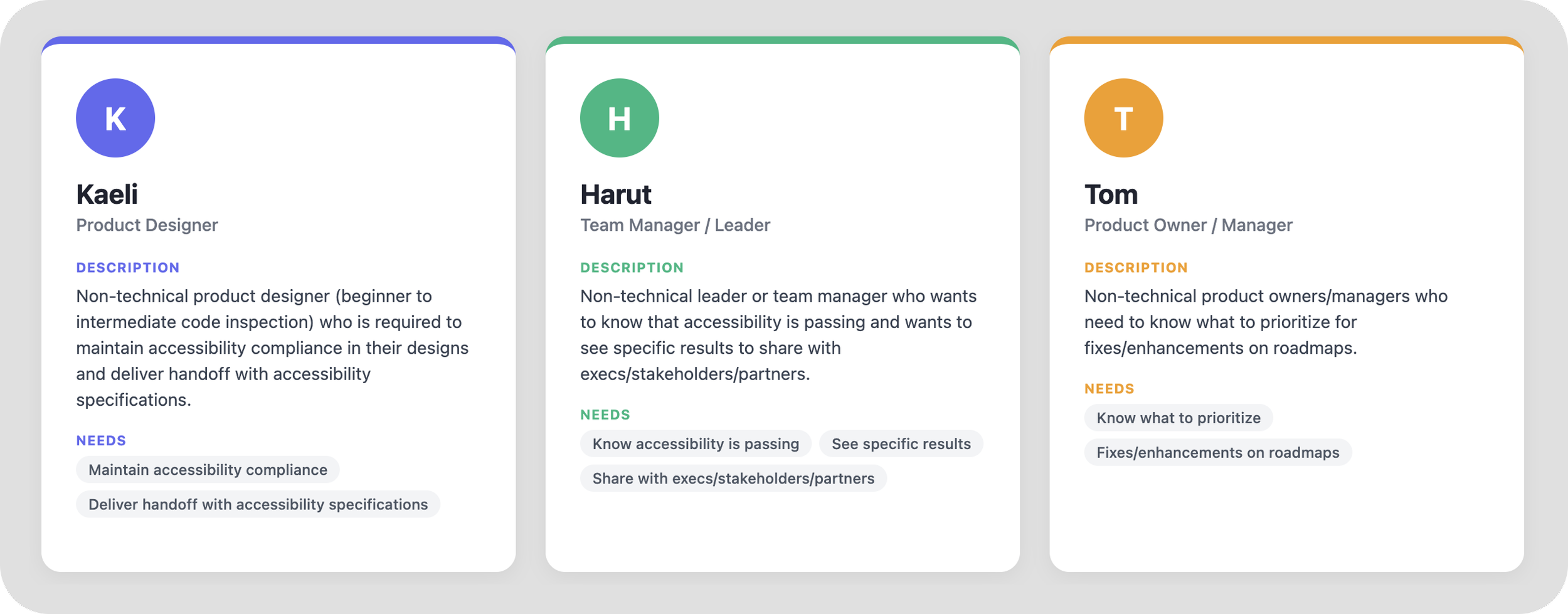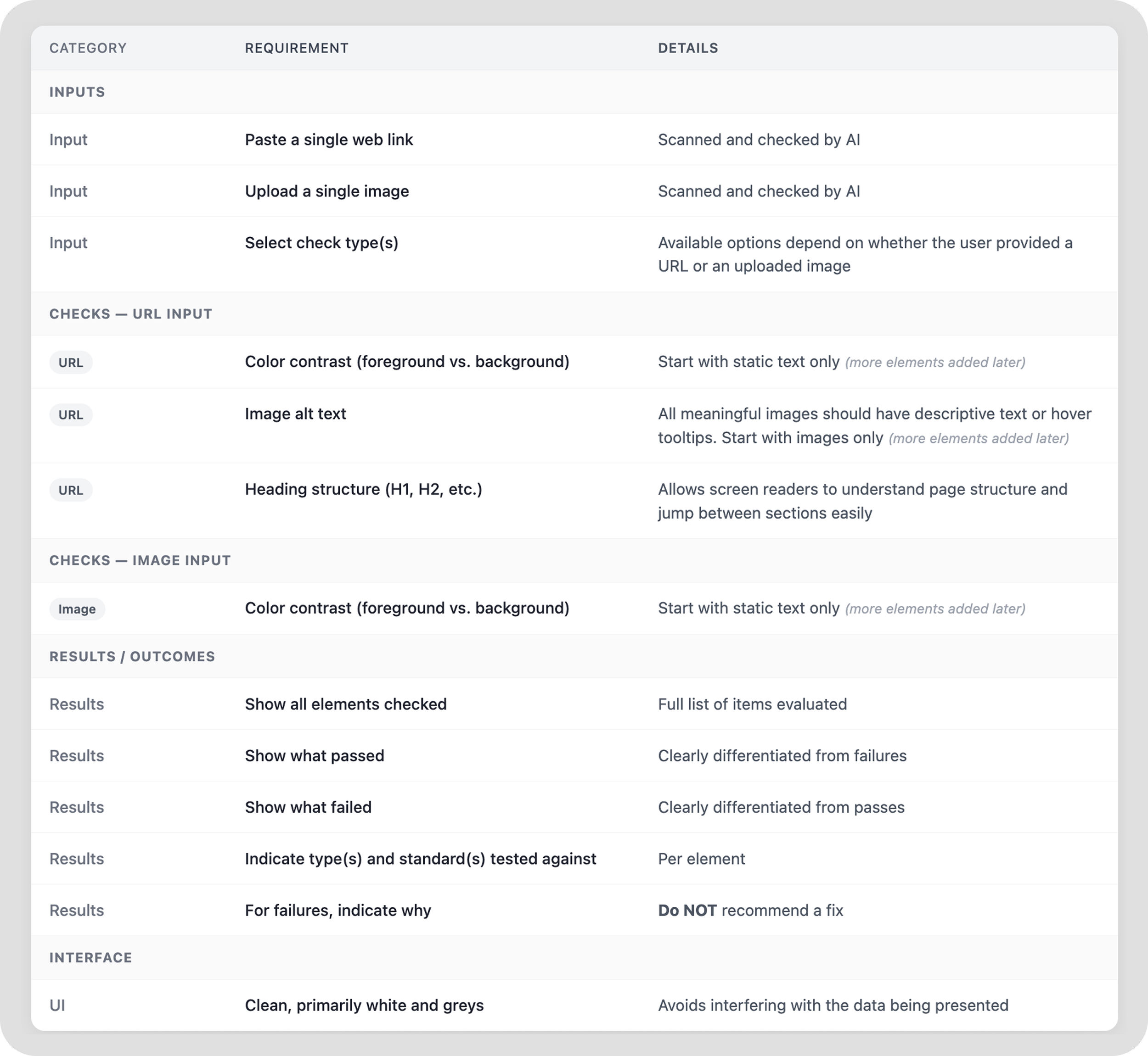“I’m looking to create an accessibility checker that can be used by designers and non-technical roles that is quick, simple, accurate and reliable and uses WCAG 2.2 accessibility guidelines as the default standards for the tool. I'm going to start with a few basic capabilities to target an MVP version of the tool: